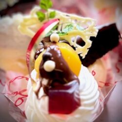 ぶどうのドゥーブルフロマージュ&ガナッシュショコラの栗とチョコソース掛けデザート仕上げ