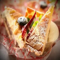 焼き林檎入りダブルクリームシュー&ピスターシュのデザート仕上げ