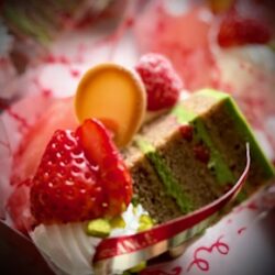 苺ジュレ掛けクレーム・アンジュ&ピスターシュのデザート仕上げ