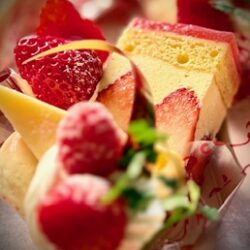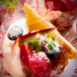 クレームアンジュ&ラ・フランスのタルトのベリー添え、デザート仕上げ