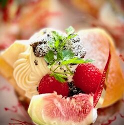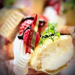 チーズケーキ入りカスタードクレープ巻き&ノワゼッティーヌのチョコソース掛け、デザート仕上げ
